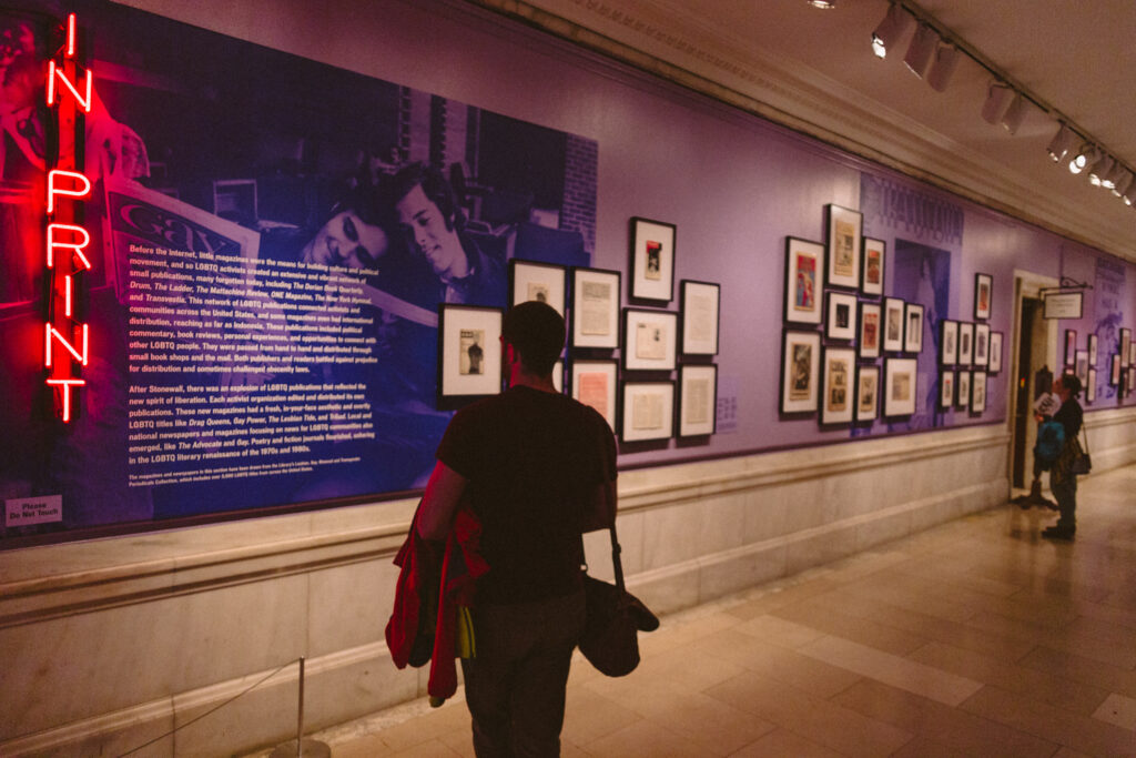 The exhibit features a collection of photos by photojournalists Kay Tobin Lahusen and Diana Davies as well as numerous zines, flyers, posters, and other printed materials from the era. Walking through the exhibit, you’ll find it’s divided in different themes: the Stonewall Riots, Resistance, Bars, In Print, and Love.